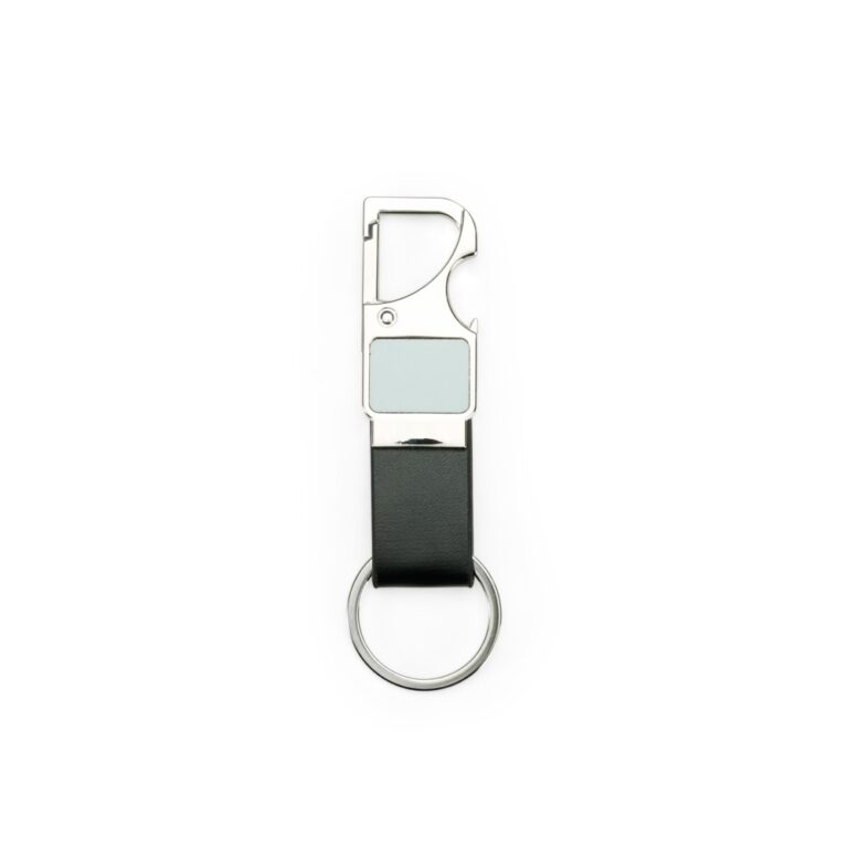 Chaveiro em metal com tira em couro sintético. Possui mosquetão e pode ser utilizado como um abridor de garrafas.